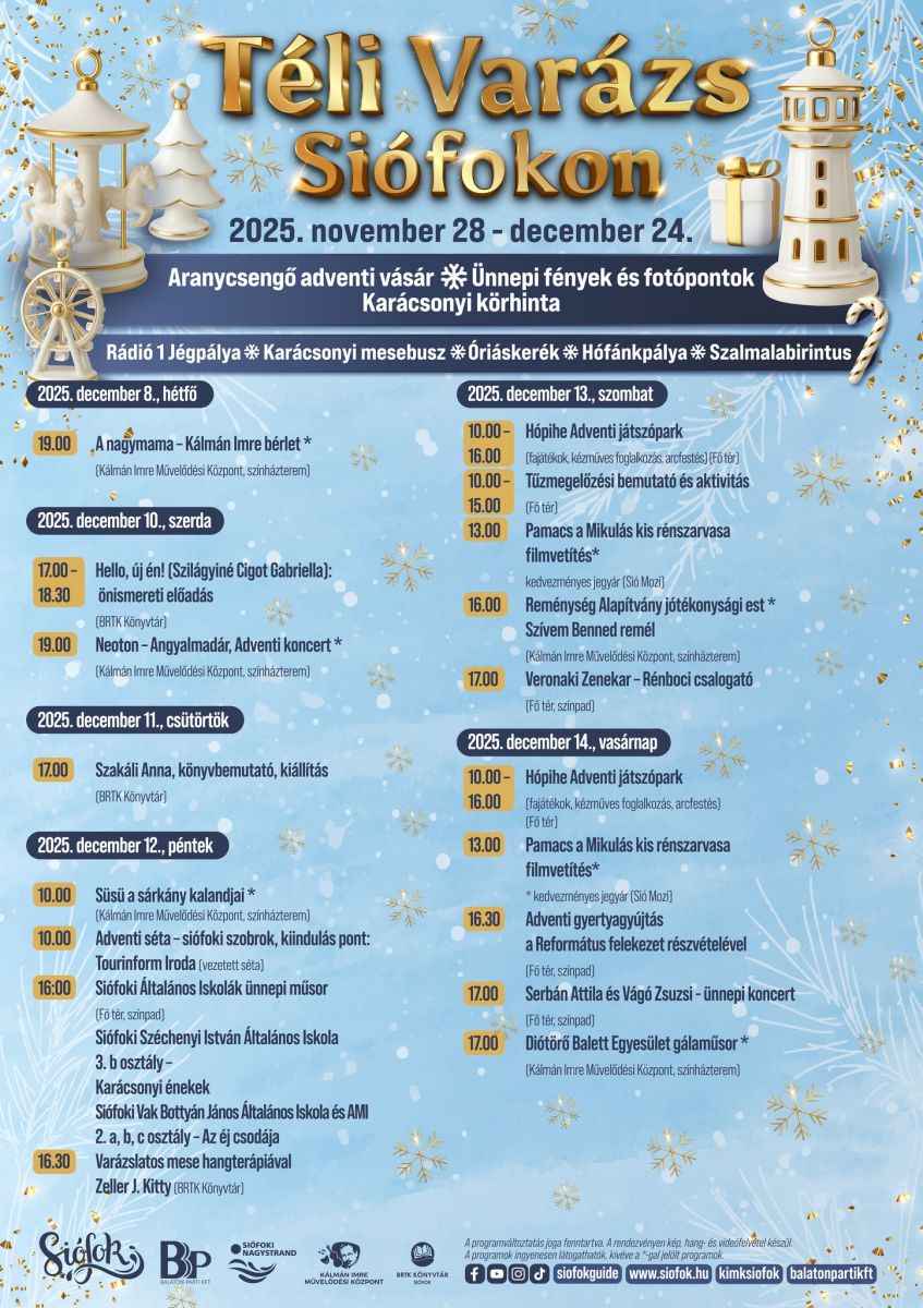 Az adventi időszakban Téli Varázs programsorozattal és egyedülálló téli attrakciókkal várja a vendégeket Siófok. Meghitt karácsonyi fények, ünnepváró koncertek, karácsonyi körhinta, forró téli csemegék, elbűvölő gyermekprogramok és varázslatos hangulat készülődik a Víztorony körül, a város Fő terén.