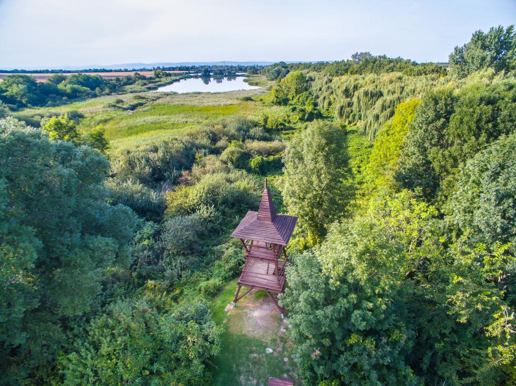 A terület déli határa egy 64 hektáros erdőtömb, nyolcvanéves cseres-tölgyes faállománnyal. 1998-ban készült el a 9000 méteres tanösvény, amely a jellegzetes élőhelyeket mutatja be, magyar, német és latin nyelvű tájékoztató táblákkal segít megismertetni a növény- és állatvilágot. Itt látható például két felhagyott külszínfejtésnél a több százas partifecske kolónia és a gyurgyalagok élőhelye. Itt van az európai madárfajok vonulási útvonala is. Ősszel és tavasszal a halastavak pihenő és táplálkozó helyet biztosítanak számtalan, hazánkban nem honos madárnak, melyek vonulás idején nagy tömegben lepik el a környéket. A kirándulók egy tavi és egy erdei pihenőhelyen fogyaszthatják el elemózsiájukat.