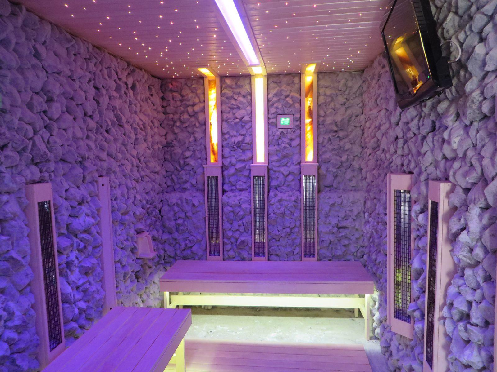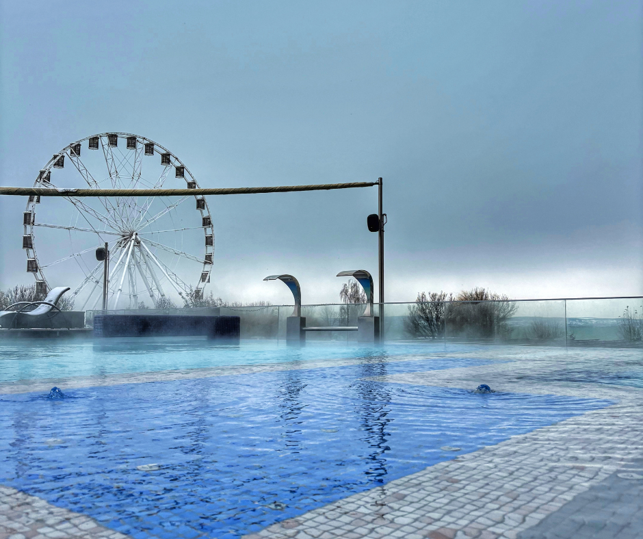 Különleges és emlékezetes élmény a téli hidegben vagy akár hóesésben nyakig elmerülni a nyitott, fűtött vizű medencében a kellemesen meleg vízben, miközben a finom, meleg gőz vesz körül, amihez a hátteret az Óriáskerék és a Balaton látványa szolgáltatja. A medence zárt folyosón, kényelmesen közelíthető meg, így a kinti hideg csak élmény marad, nem kellemetlenség. A parajdi sótéglákkal borított falú, fényterápiás ledekkel felszerelt, infraszauna meghitt melege tökéletes lezárása egy téli balatoni napnak.