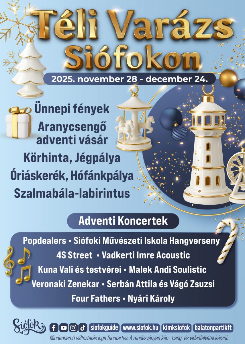 Az adventi időszakban Téli Varázs programsorozattal és egyedülálló téli attrakciókkal várja a vendégeket Siófok. Meghitt karácsonyi fények, ünnepváró koncertek, karácsonyi körhinta, forró téli csemegék, elbűvölő gyermekprogramok és varázslatos hangulat készülődik a Víztorony körül, a város Fő terén.